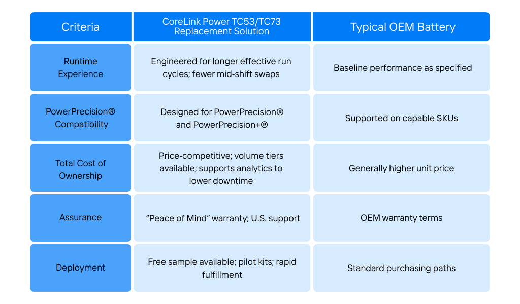 THE FIRST FULLY COMPATIBLE REPLACEMENT FOR ZEBRA® TC50 AND TC70 LINE OF BATTERIES Longer lasting. Better pricing. Fast fulfillment.